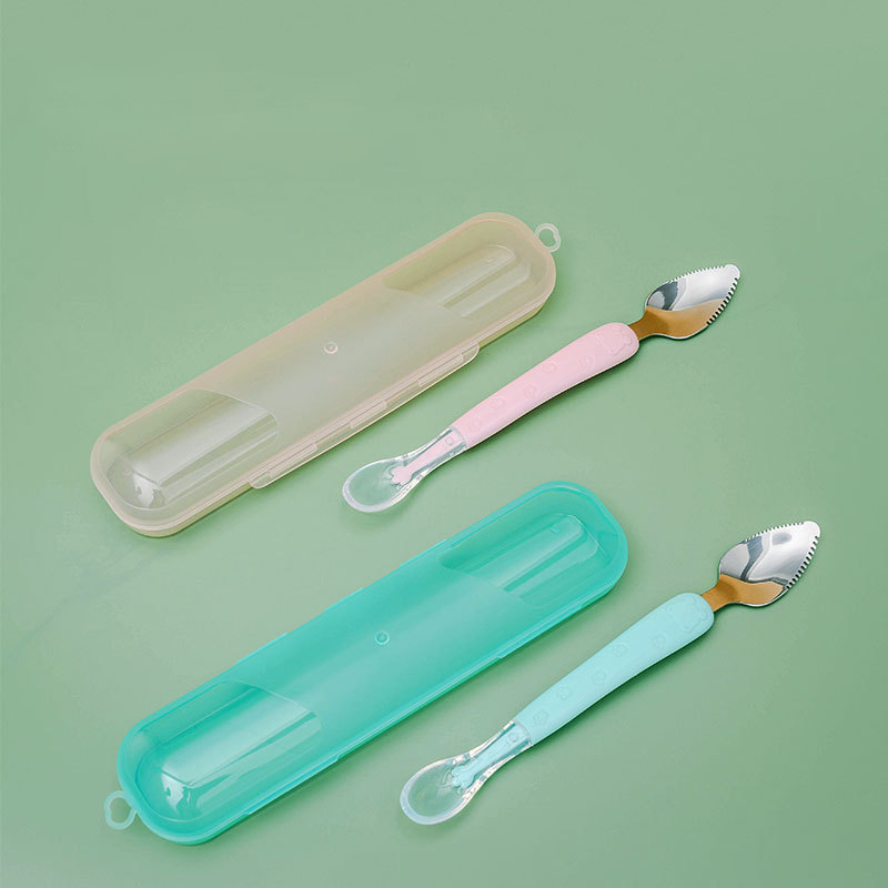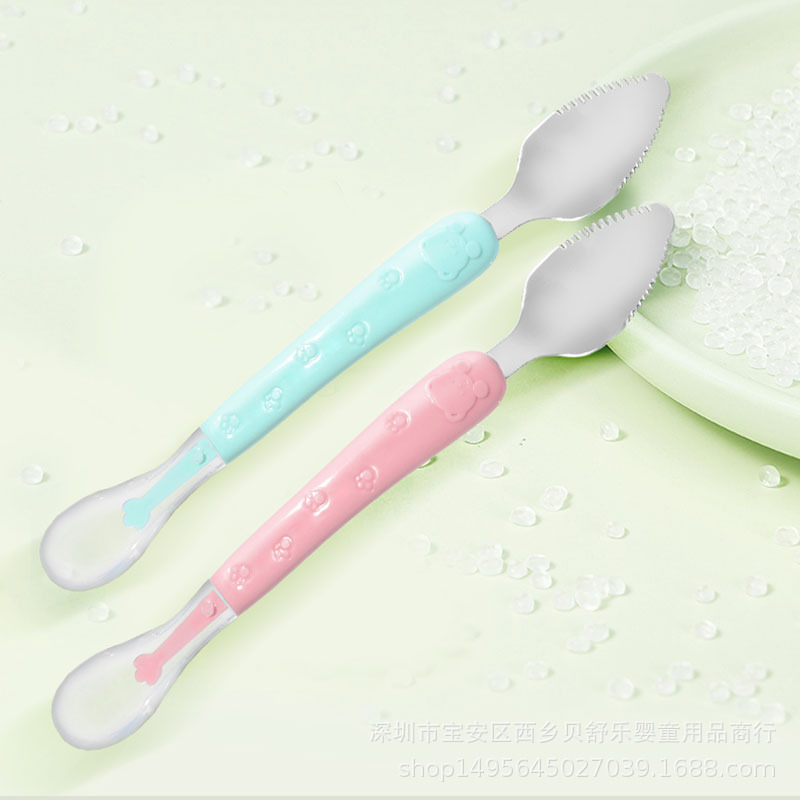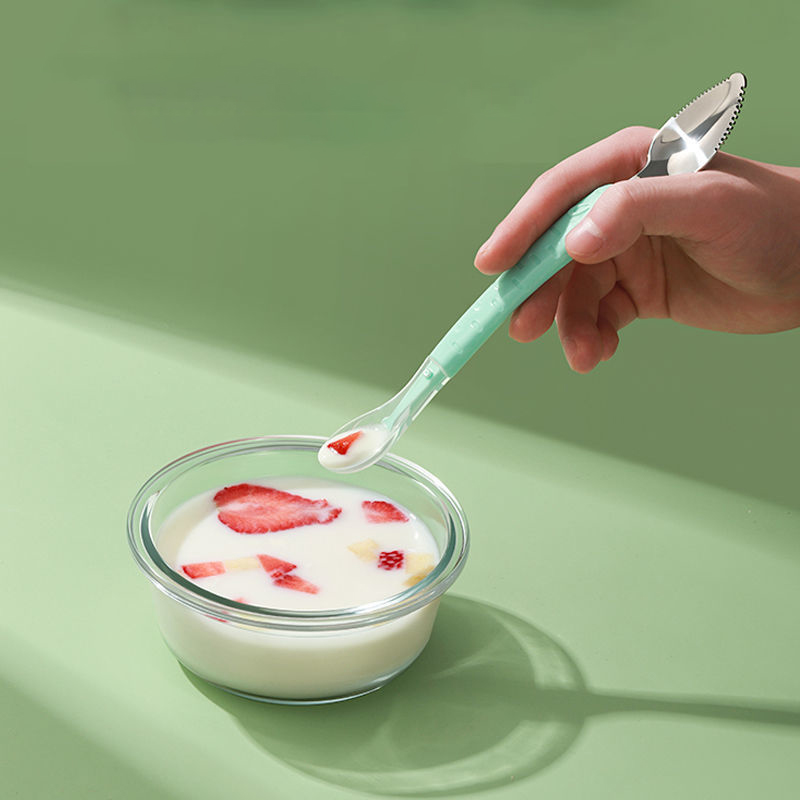 🔹Thìa có 2 đầu tích hợp tiện cho mẹ lắm, đỡ phải lách cách dùng máy xay hay tốn công để dầm quả, chỉ cần bổ đôi trái táo, hay 1 miếng thanh long... dùng đầu inox để nạo nhỏ và dùng đầu silicon để đút cho bé ăn.
